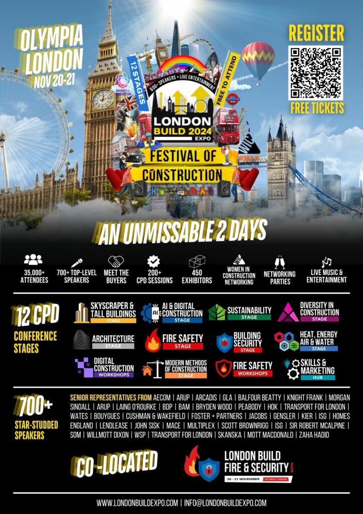 London Build, the UK’s leading and largest construction show will be back at Olympia London this November and this year it is doubling in size, taking over both the Grand & National Halls. Get ready for an unmissable two-days jam-packed with incredible content, networking parties, the UK’s biggest Festival of Construction and more. The show is co-located with London Build Fire & Security Expo.