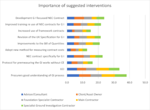 - The development of a GI focussed NEC contract or one specifically for GI was also considered to be a major priority based on the cumulative response from the two questions as flagged above. This was particularly supported by the Ground Investigation Contractors. This was also associated with significant support for improved training in the use of the NEC contract for GI