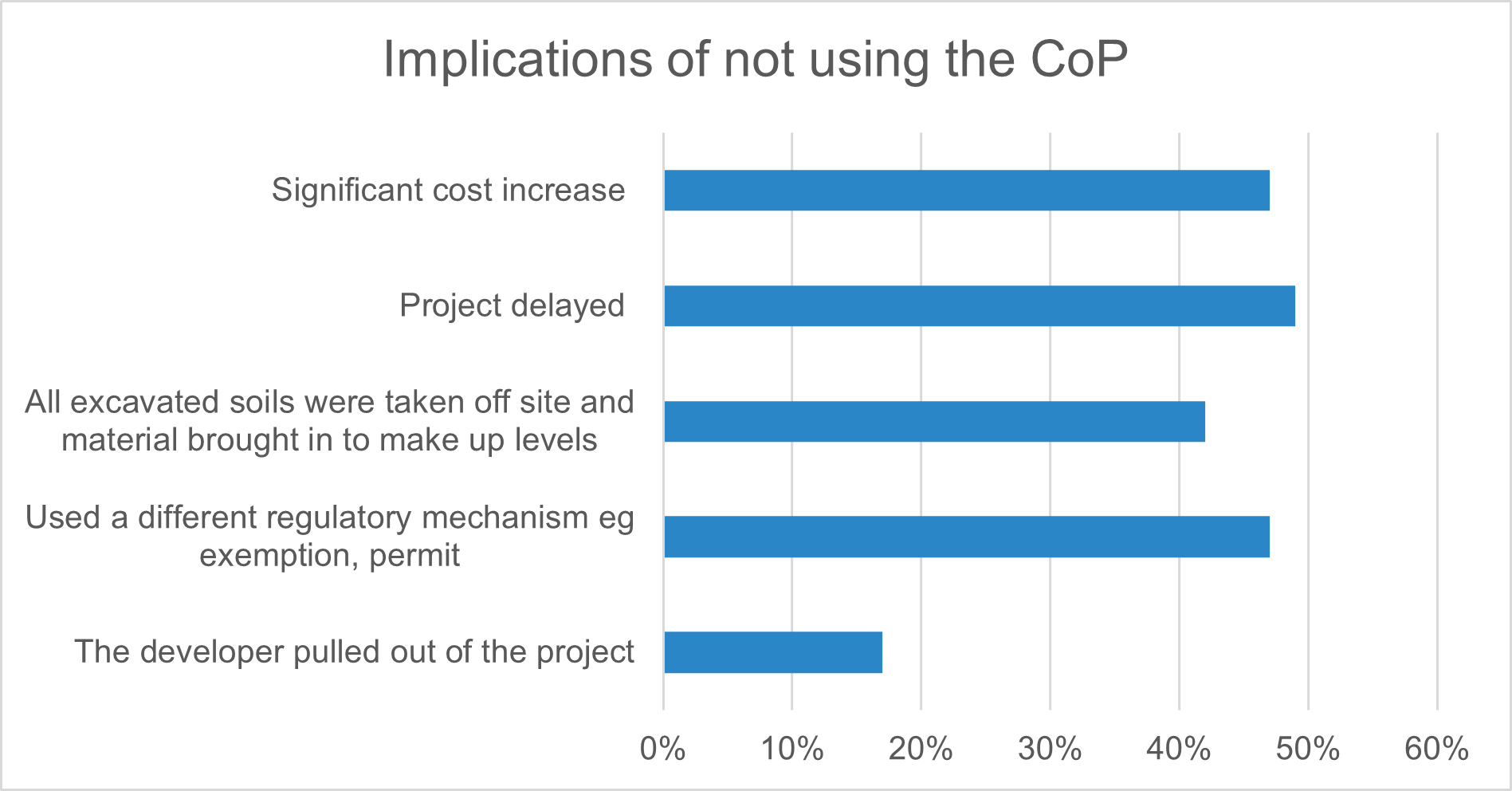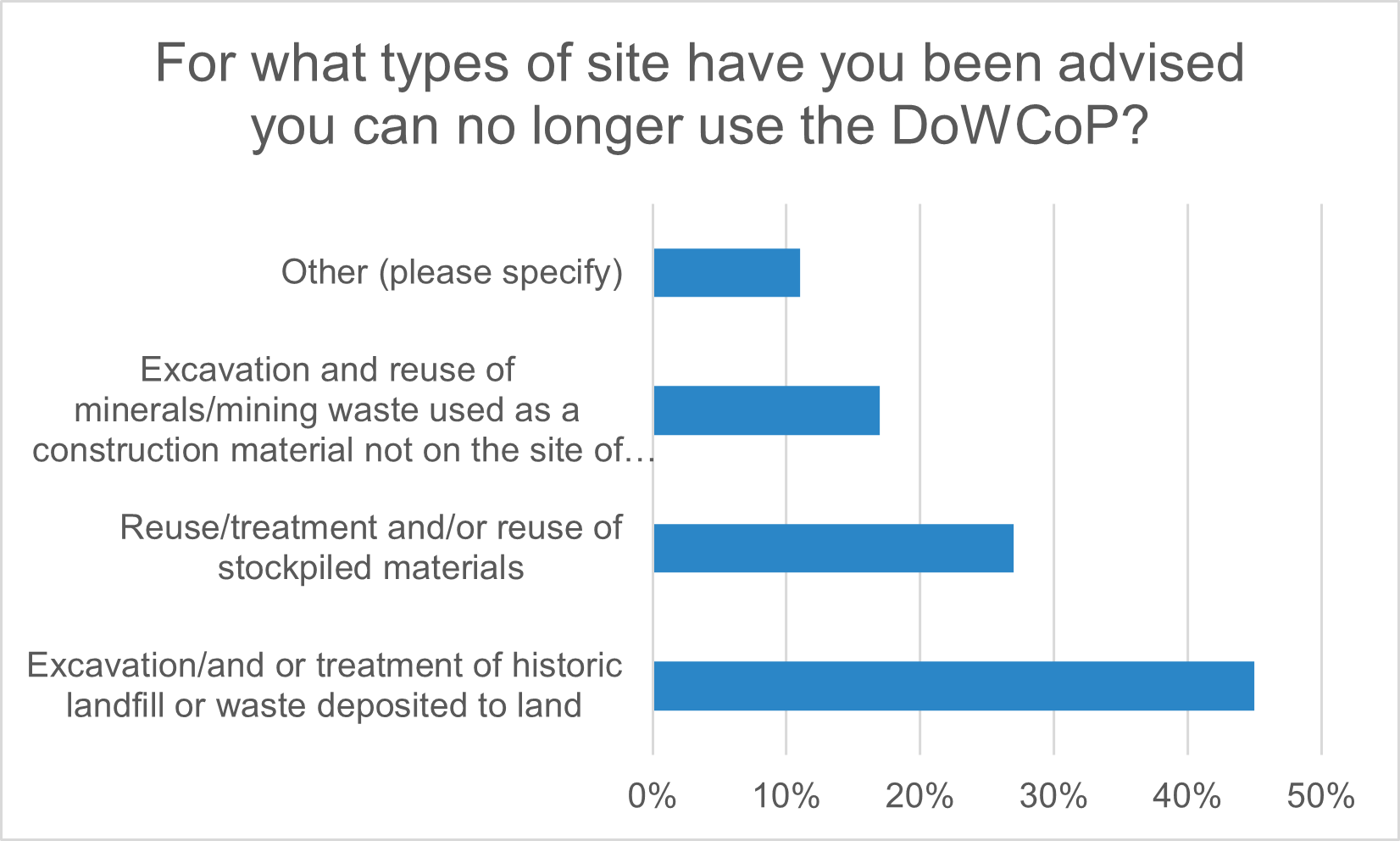 Over the last three years half the respondents reported being told by the EA they could no longer use DoWCoP for projects they would previously have done so (Graph 1) with the main reason being cited as development of historical landfills. One respondent indicated that personal discussions with EA Area Officers has clearly shown that Area Officers are also frustrated.  They can often see environmental benefits and gains from a proposal that they are told is no longer in line with EA national thinking on the use of DoWCoP.  One QP responded “It is not always going to be acceptable to reuse material from a historical landfill, or a stockpile, these are site specific decisions and often, will not be straight forward.  Rather than a blanket, include or don’t include in DoWCoP, each case should be considered in terms of its Conceptual Site Model.”