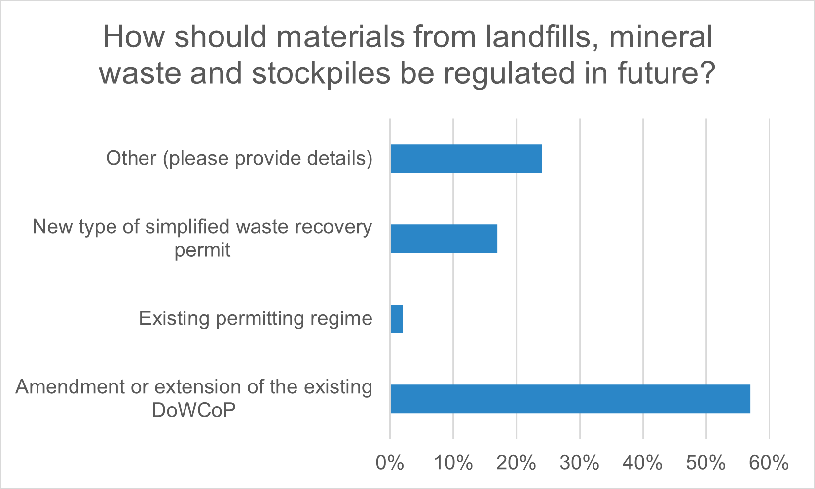 There is a significant view from respondents that the DoWCoP should be extended to cover development of landfills and materials from former mining activities including old stockpiles (Graph 3). The existing permitting regime has few advocates within the industry with some calls for a simpler (quicker) standard rules waste recovery permit.