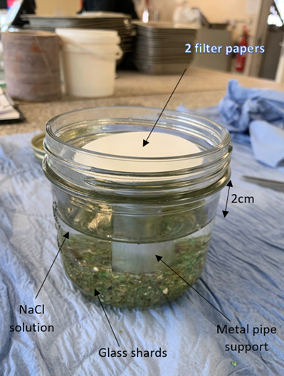 Clean glass shards or beads were placed at the base of the jar to support the plastic or metallic pipe upon which the filter paper disks were placed. Prior to placing the filter-paper disks, the glass jars were filled with the salt solutions.