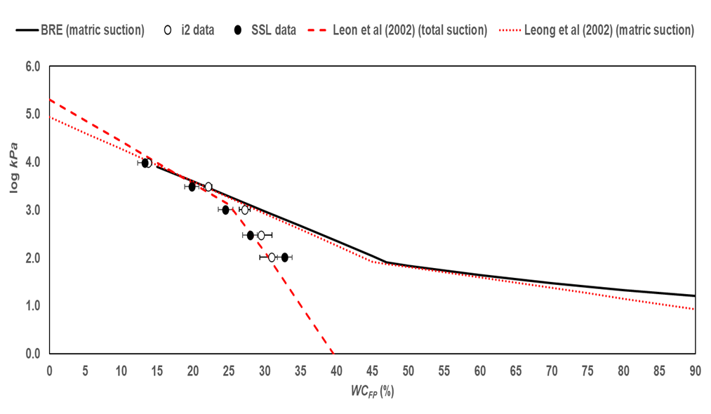 The osmotic suction π values in Table 1 are compared with the values generated by using the equations in 1) BRE IP4/93 for matric suction and 2) Leong et al. (2002) for total and matric suction (Fig. 2):