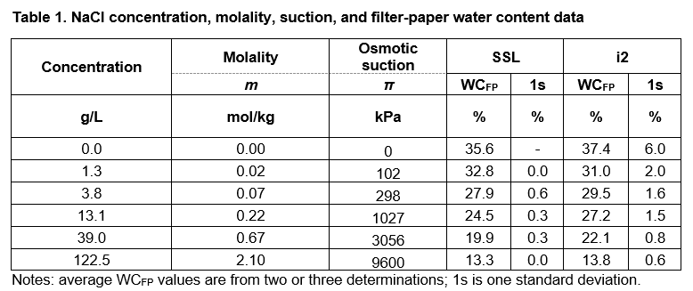 The data from the calibration tests at the SSL Bristol and i2 Analytical laboratories are given in Table 1. The 0% NaCl solution was deionised water. The filter-paper water content data suggest good reproducibility and repeatability between and within laboratories, respectively. The suction values at 23 ⁰C were calculated using the online molality calculator of omnicalculator.com.