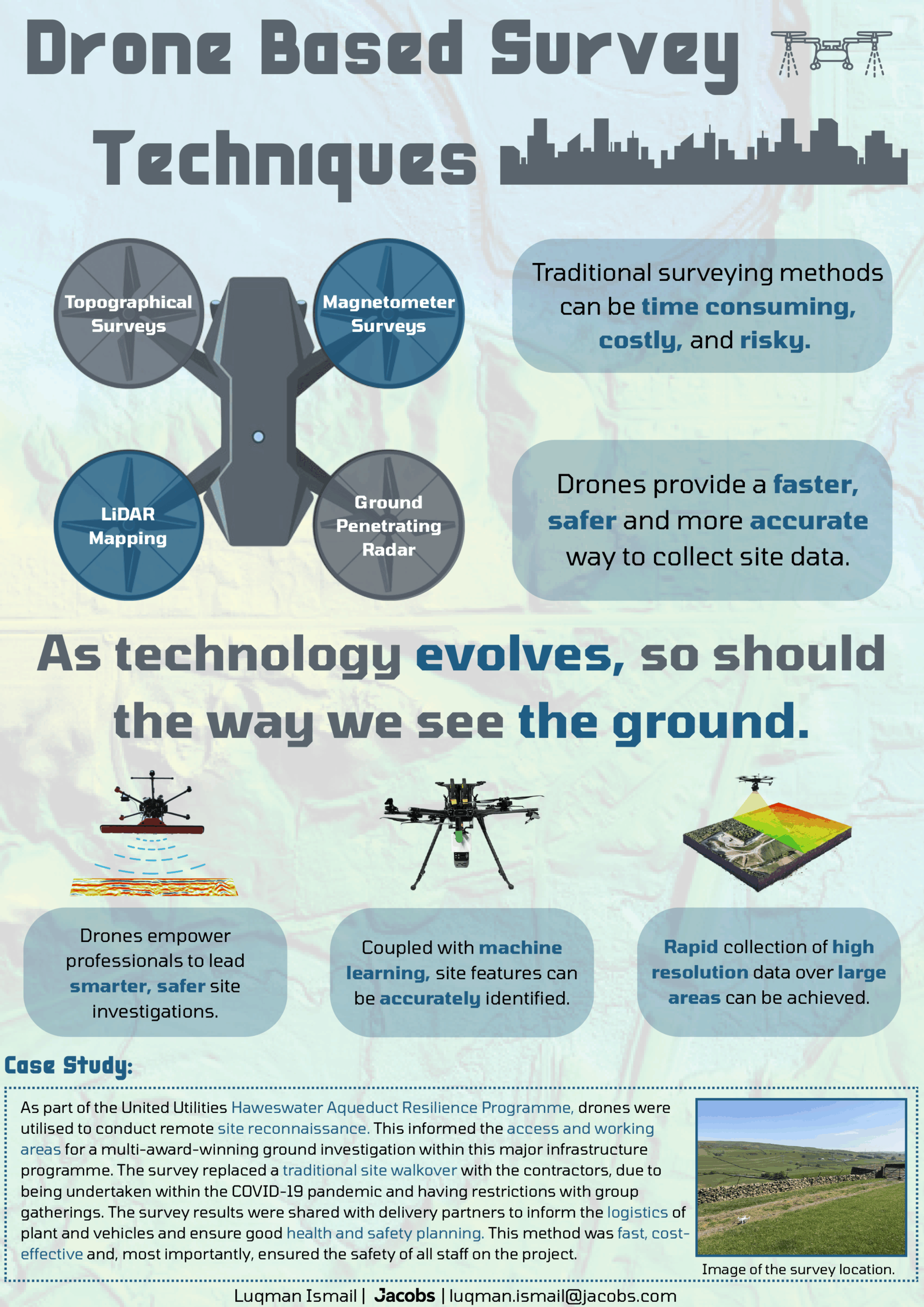 Despite not being directly involved with drone-based site investigation, I came across this innovative technique during a lunch and learn at Jacobs, which comprehensively introduced drone-based survey techniques and their scope for the future of site investigation. Inspired by this session, I created my poster showcasing the types of surveys possible and the advantages over traditional survey methods, as well as a case study where drones were used to conduct a remote site reconnaissance.