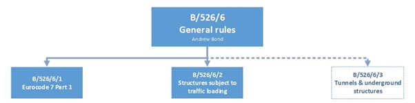 B/526 is the committee responsible for geotechnics in the UK. This committee which is made up of technical experts drawn from UK contractors, consultants and clients, is split into three sub-committees, with each sub-committee responsible for one of three parts of Eurocode 7. The coverage or remit of these sub-committees is shown in Figure 2.