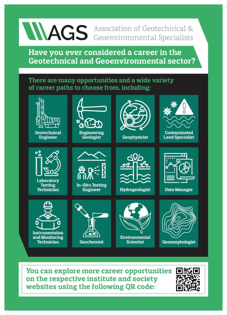 We know many organisations already take part in careers events to promote their businesses. Now we are asking our members to go one step further: help us raise awareness of geoscience as a profession by distributing the AGS Early Careers Flyer at these events. Together, we can amplify our reach and spark interest among students who may not yet have considered this field.
